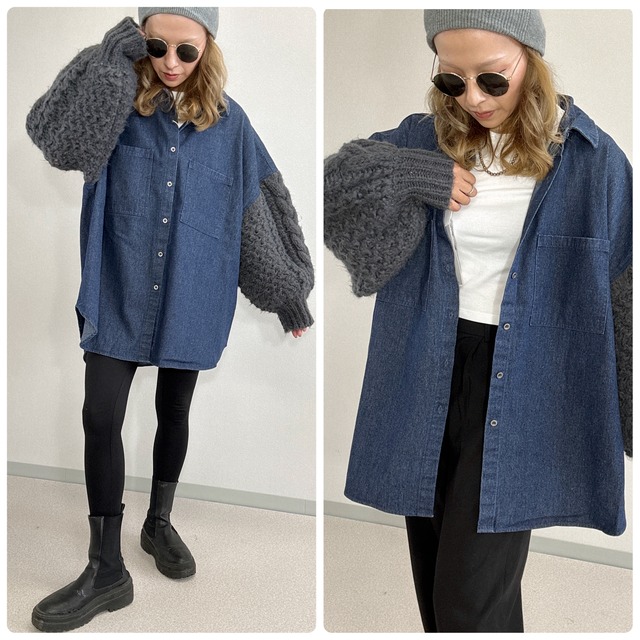 シャツの気軽さに、ニットの主役感をプラス。 トレンド感あふれるデニム×ニットの異素材ミックスで仕立てた、軽羽織にもアウターにも使える万能シャツジャケット。ベースにはヴィンテージライクな綿100%デニムを使用し、ナチュラルな風合いと安心感のある着心地を確保。袖にはふんわりと立体的なポリエステルニットを大胆にドッキングし、ボリュームと素材のコントラストで唯一無二のスタイルを演出します。 袖のニットパーツは、手首に向かって広がるスリーブラインとふわモコの編地が特徴。まるでアームウォーマーを合わせたようなデザインで、アクセ感覚の華やぎをプラス。バックスタイルには前後差のある着丈とラウンドカットが施され、ルーズなシルエットでもだらしなく見えない工夫が光ります。ジャケットほど重たくなく、カーディガンよりしっかり羽織れる、ちょうどいい存在感が魅力。 ●Fサイズ 【着丈】78/83cm 【身幅】72cm 【裾幅】75cm 【肩幅】72cm 【天幅】19cm 【袖丈】45cm 【袖口幅】8cm 【AH幅】27cm ■素材・成分:デニム部分:綿100% ニット部分:ポリエステル100%