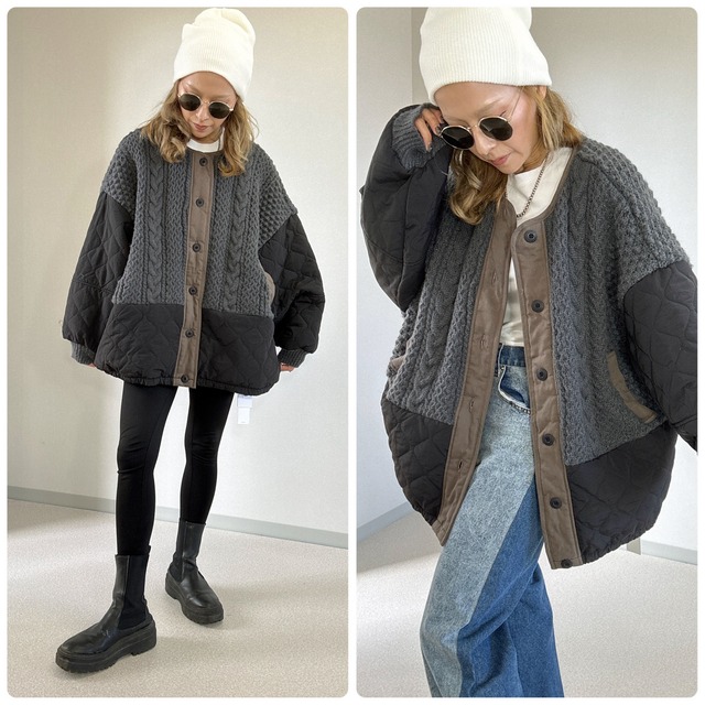 ケーブルニット×キルティング軽量ブルゾン khaki