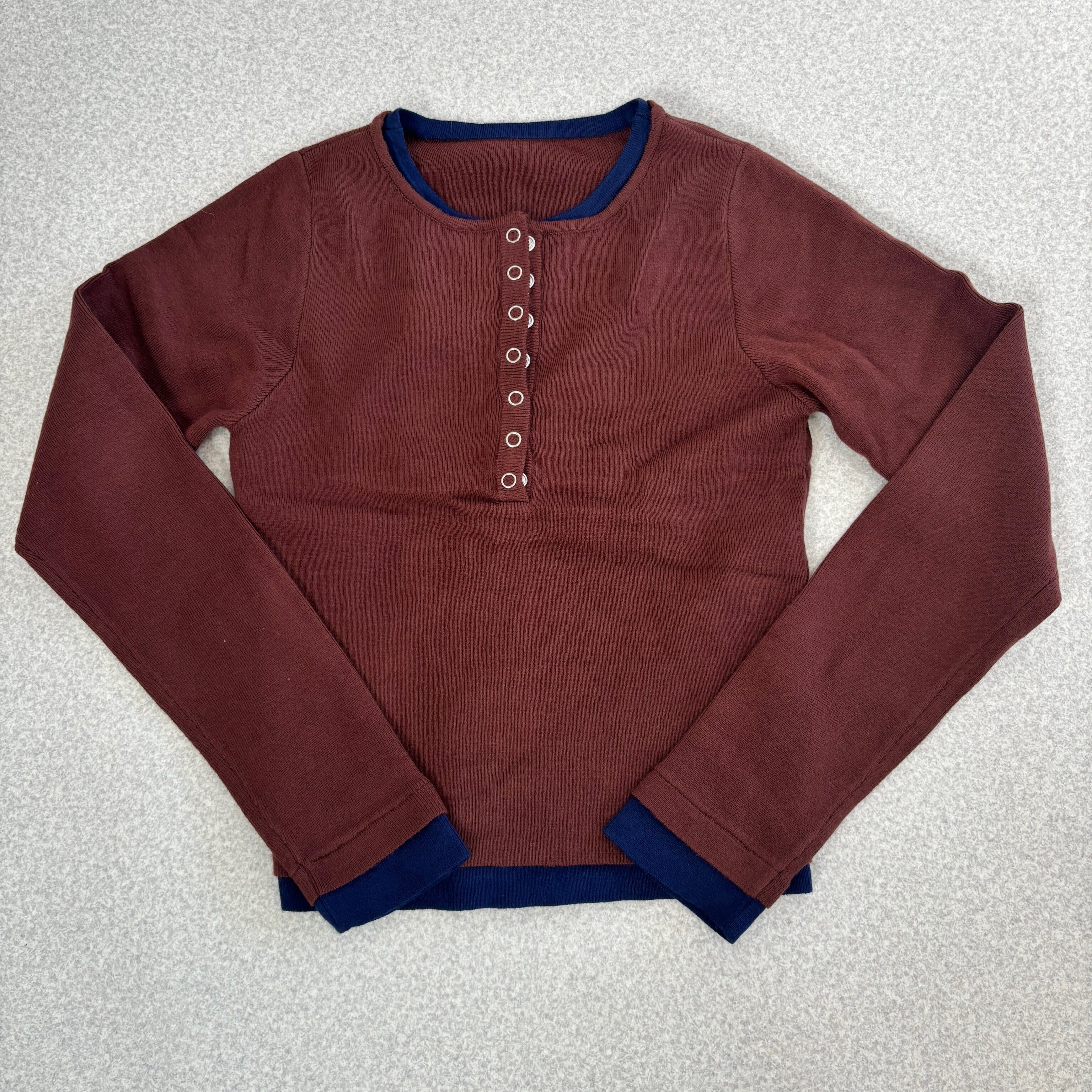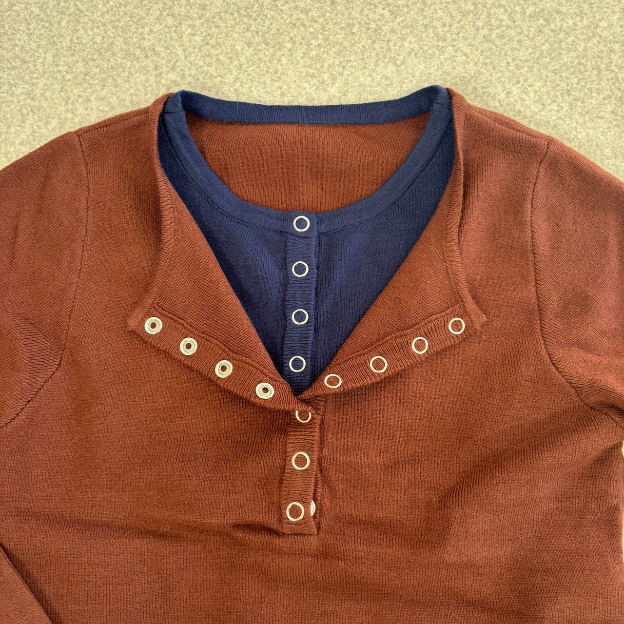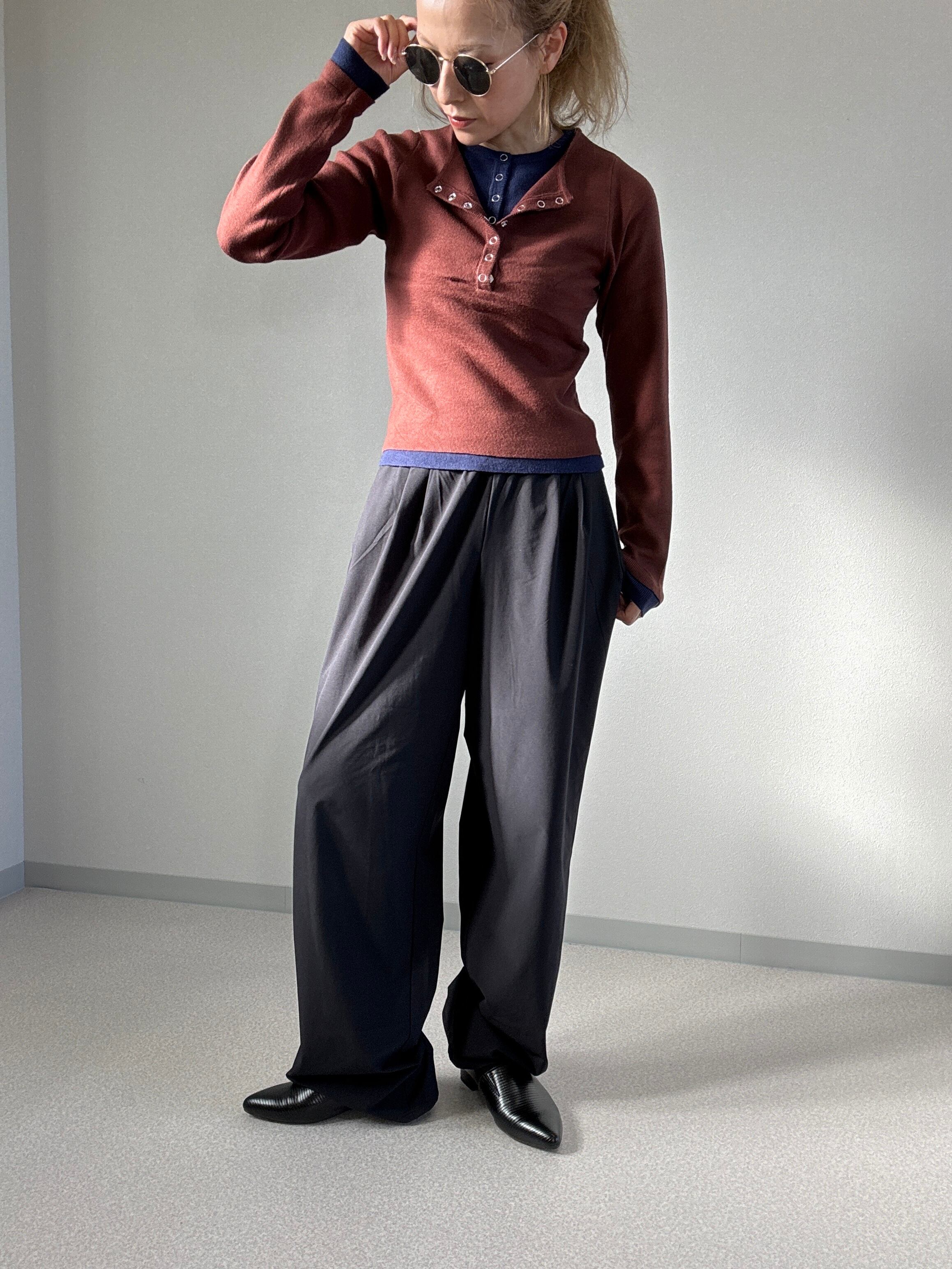 レーヨン混のヘンリーネックレイヤードニットが登場