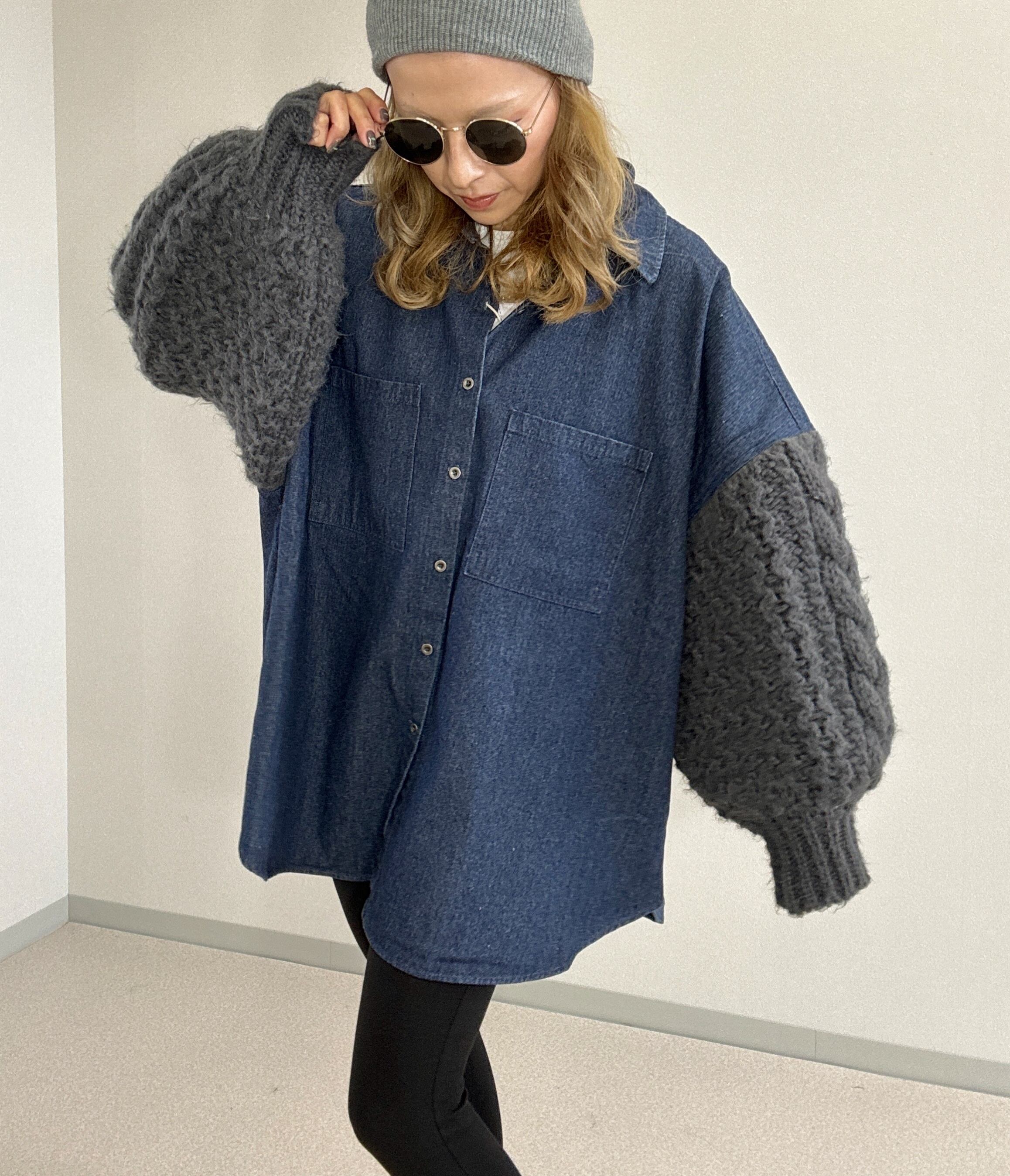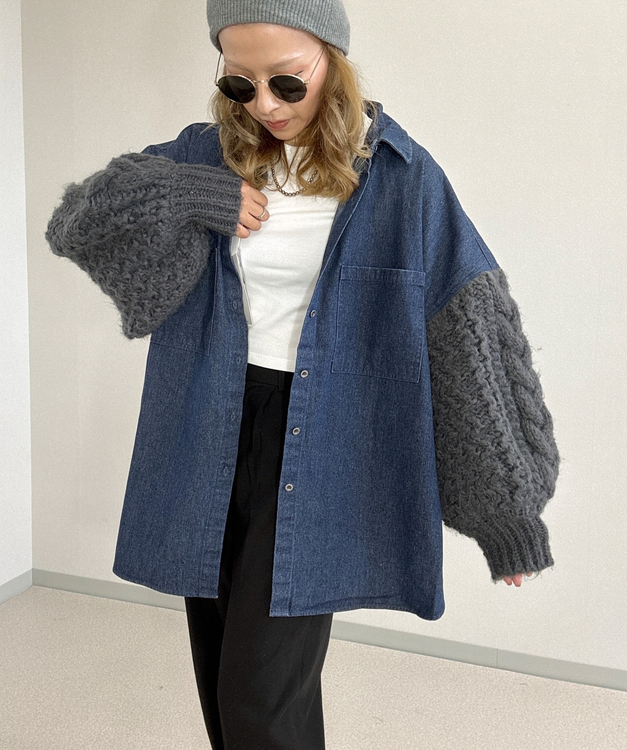 トレンド感あふれるデニム×ニットの異素材ミックスで仕立てた、軽羽織にもアウターにも使える万能シャツジャケット。ベースにはヴィンテージライクな綿100%デニムを使用し、ナチュラルな風合いと安心感のある着心地を確保。袖にはふんわりと立体的なポリエステルニットを大胆にドッキングし、ボリュームと素材のコントラストで唯一無二のスタイルを演出します。