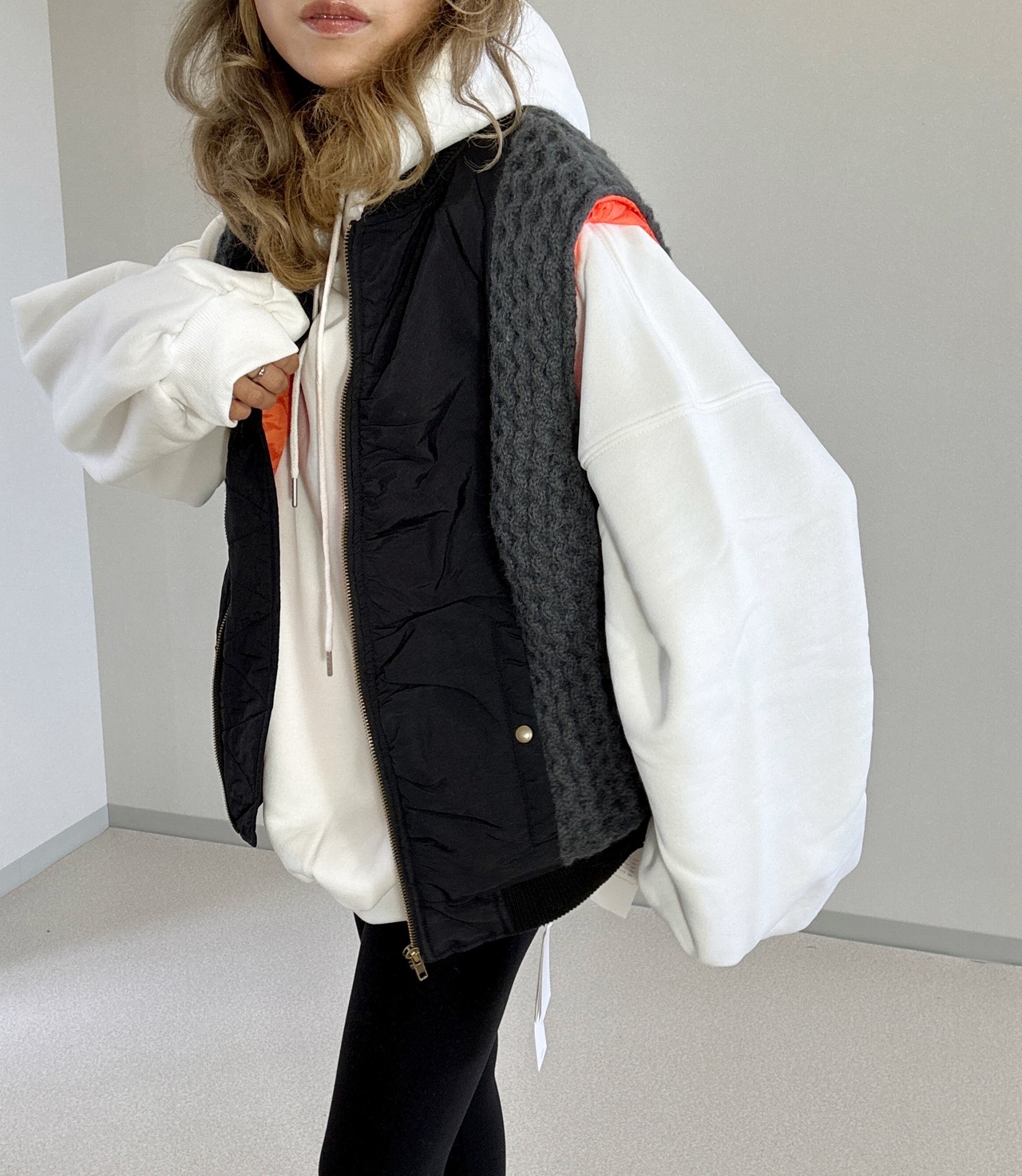前面には中綿入りのナイロンベースで、程よく立体感のあるアウトラインを形成。サイド〜バックには大胆にローゲージニットを切替え、温かみと手仕事感をプラス。まるで異なるアイテムをドッキングしたような、“リメイク風”の存在感が特徴です。