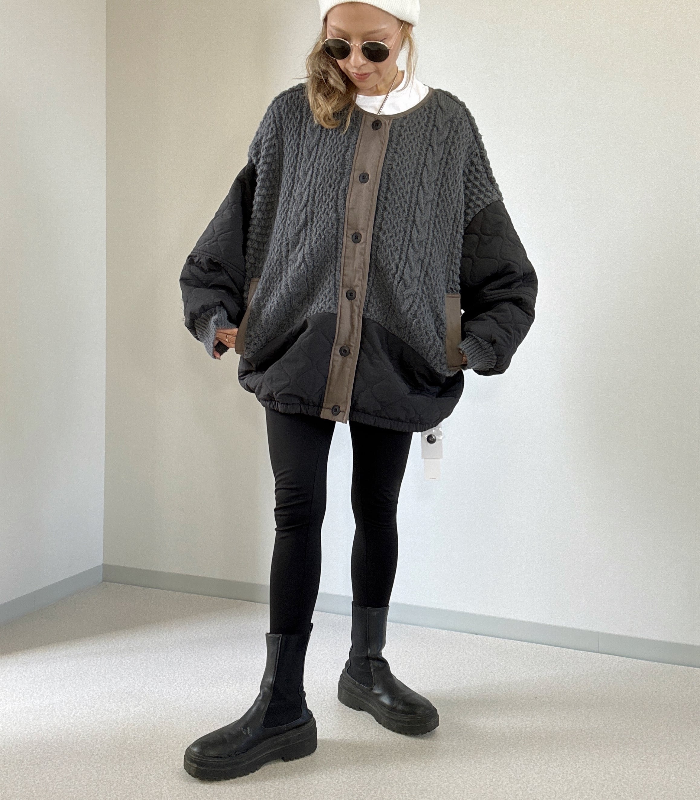 ノーカラー 裾キルティング ニットブルゾン black