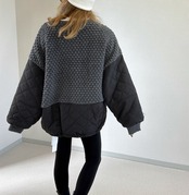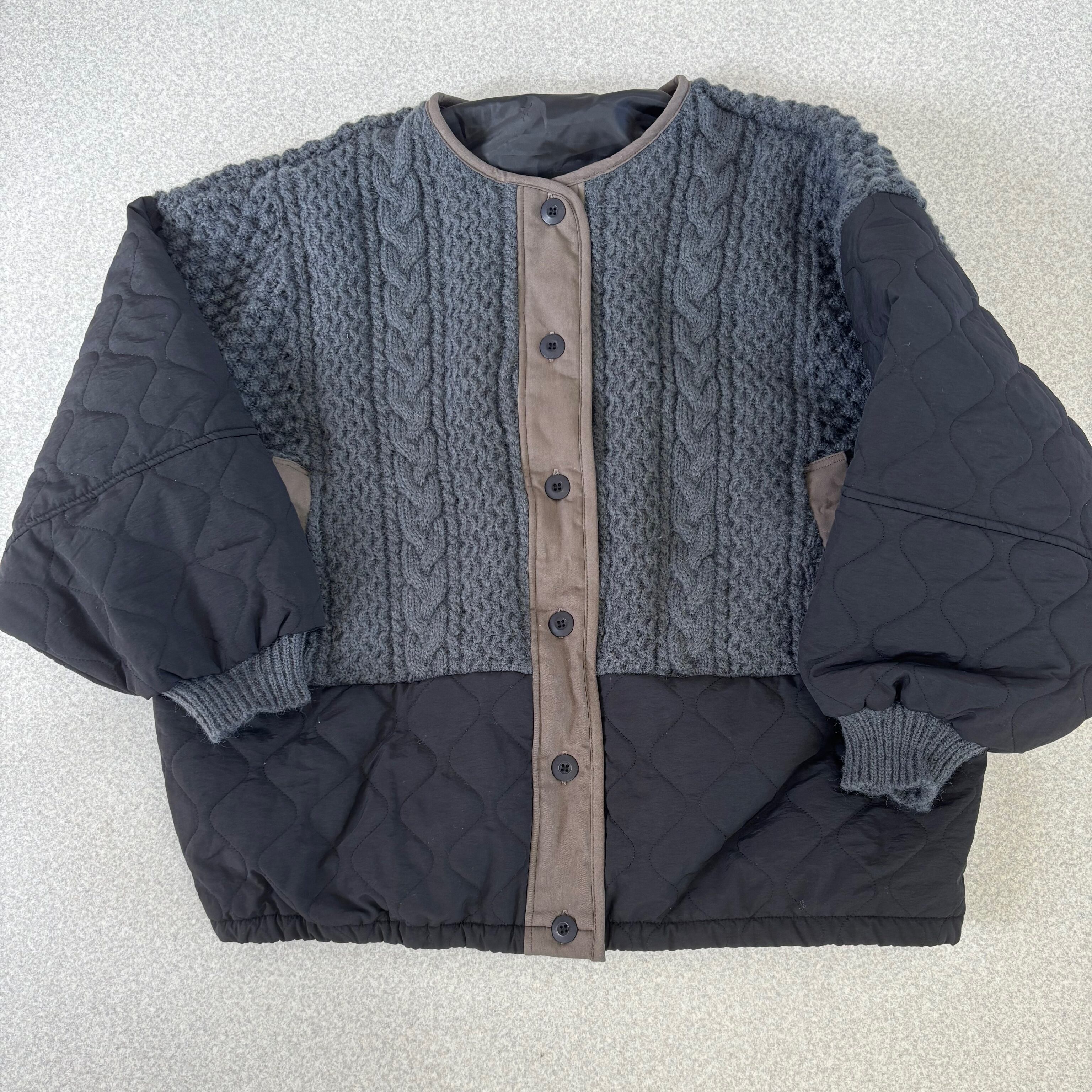 表情豊かなアラン編みのニットと、軽く膨らむキルティング裏地を融合させたノーカラーのブルゾン。編地部分は目が詰まりすぎず適度な透け感も感じる、手編みのようなクラフト感を演出する編み組織。ニット特有の柔らかくゆるやかな伸縮性が、身体の線を優しく包み込みながらも、重たさを感じさせない軽やかな着心地をかなえます。そこに中綿を入れたキルティング布帛を裾や袖部分に配し、別布使いのコンビネーションで異素材のハーモニーを織り成すミックス感が特徴です。キルティング部分はシャープな線の表情があり、編みの柔らかさと布帛の構造的な凛々しさがバランスよく融合しています。裏地は滑りよく、中綿と表地のグラデーションを支えるような役割を果たし、着脱のストレスを抑える工夫も。リブ部分や別布の切り替えは立体感を強め、細部の緻密さを感じさせるつくりになっています。