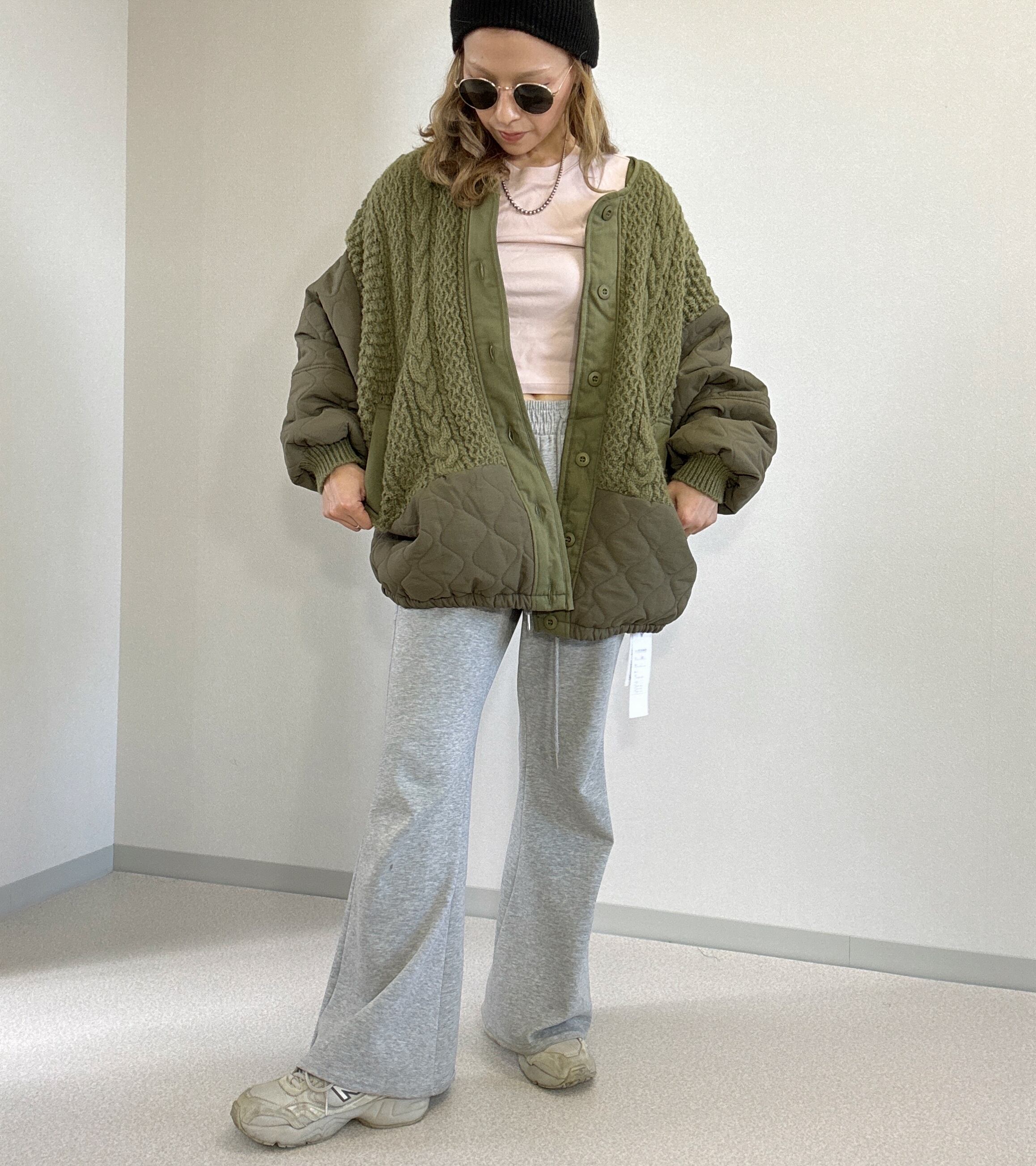 ノーカラー 裾キルティング ニットブルゾン khaki