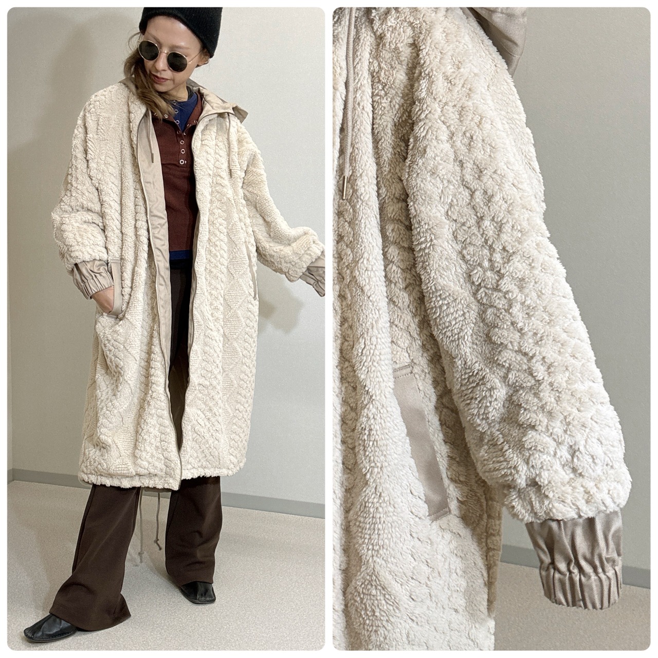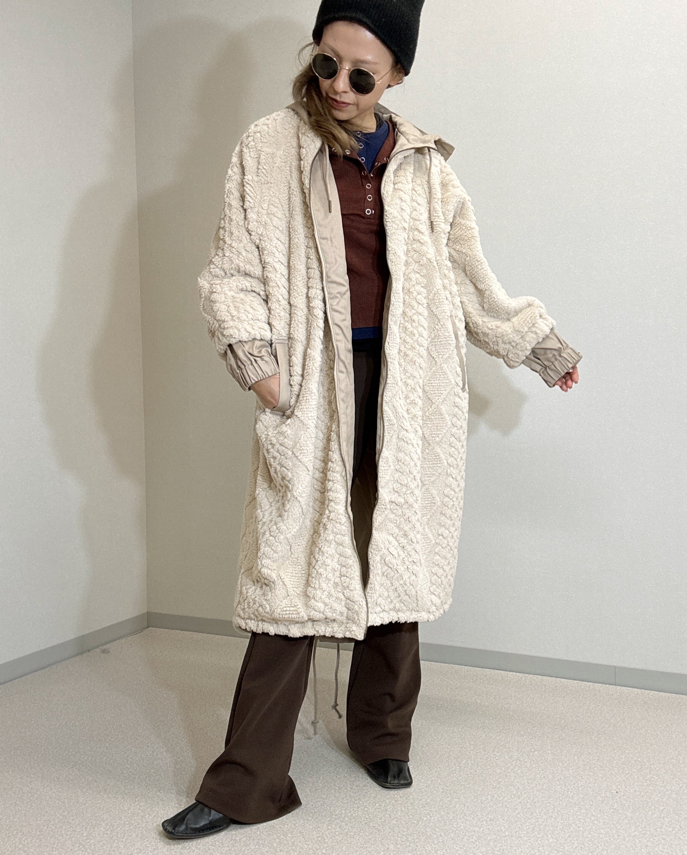 全体にあしらわれた柄ボアは、毛足が程よく揃った柔らかなタッチで、見た目以上に軽やかな着心地が魅力。密に編まれたボア面はしっかりと空気を含み、保温性が高く、冬の冷気を受け止めずにふんわりと身体を包んでくれます。表面にはケーブル調の立体パターンが浮かび上がり、単調にならずナチュラルな奥行きを演出。もこもことしたボア素材特有の優しい風合いに、暖かみと存在感がしっかり宿っています。