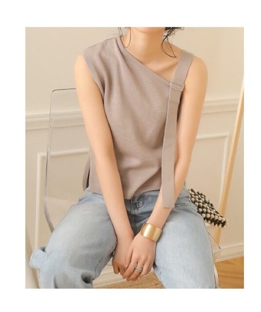 左 右非対称デザインのニットベストは、インナーにTシャツやブラウスを重ねて着るレイヤードスタイルに最適の1枚。左のショルダーストラップは金具付きで調 節可能。デザインとしてもアクセントになっています。ネックラインも開きすぎてないので、1枚で着用しても胸元を気にせず着ていただけます。ニット生地で すが、生地自体は厚すぎないので長いシーズン着ていただけます。