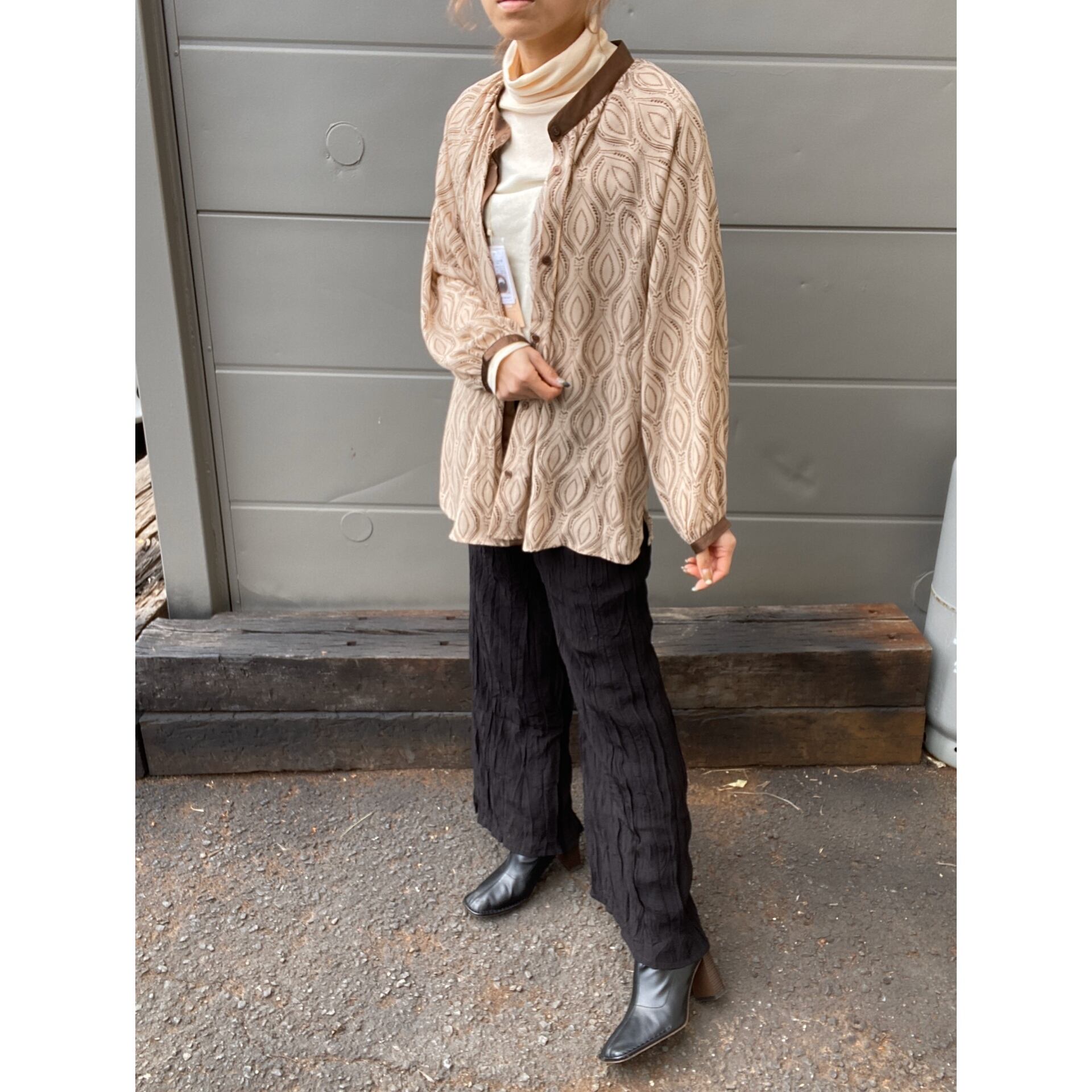 印象的なBabらしい柄が目を引く一枚。無地の配色パイピングを入れることで全体的にすっきりとしたイメージに。バンドカラーのデザインも今年らしい印象を与えてくれます。 さらっとした落ち感のある柔らかい素材感が柄のイメージを和らげてくれるのもポイント。お袖のたぷっとした感じも女性らしい表現李。かっちりしすぎず、カジュアルになりすぎない絶妙なサイズも抜け感があって◎。1枚着はもちろん、レイヤードスタイルに映えるバンドカラーシャツは今季もマストアイテムです。