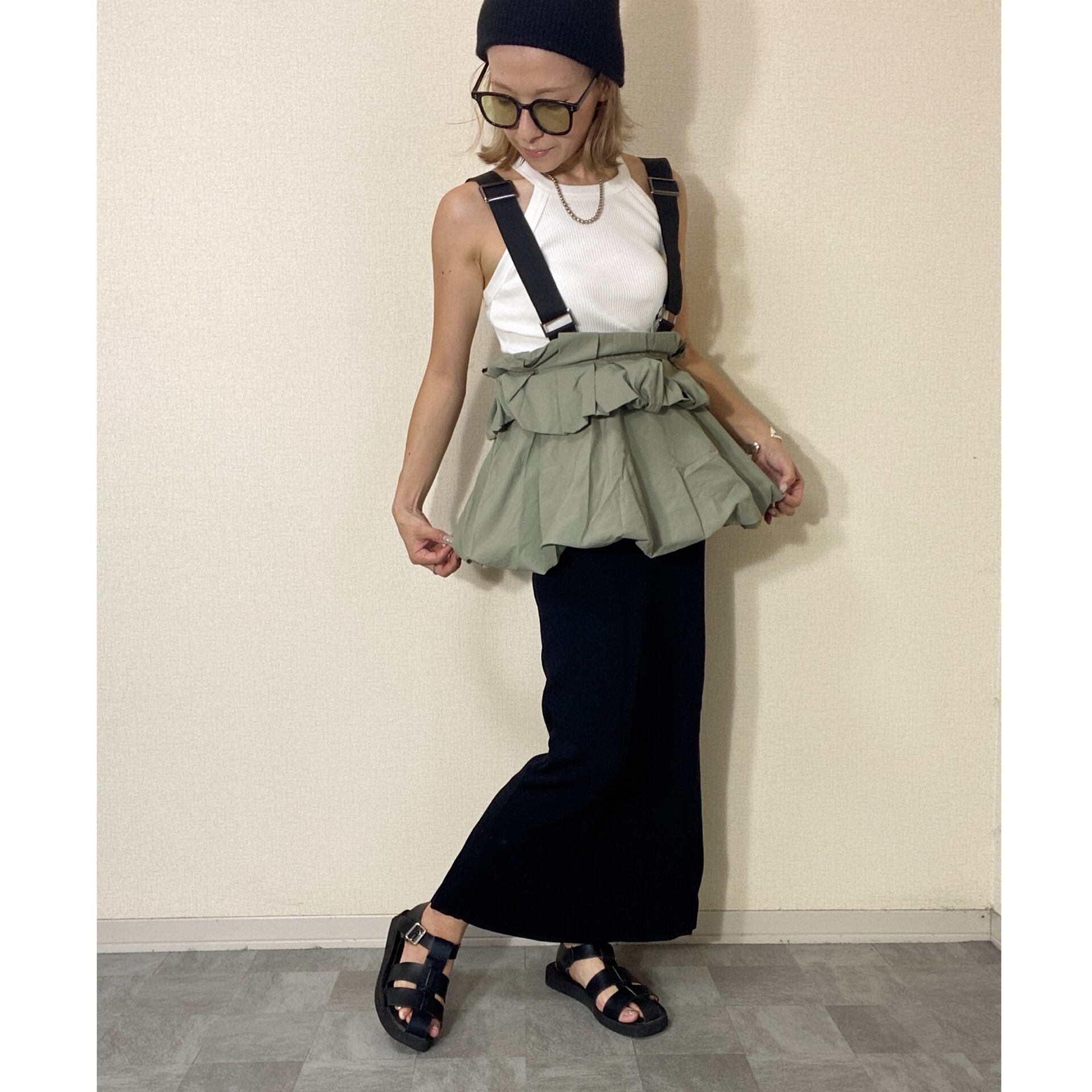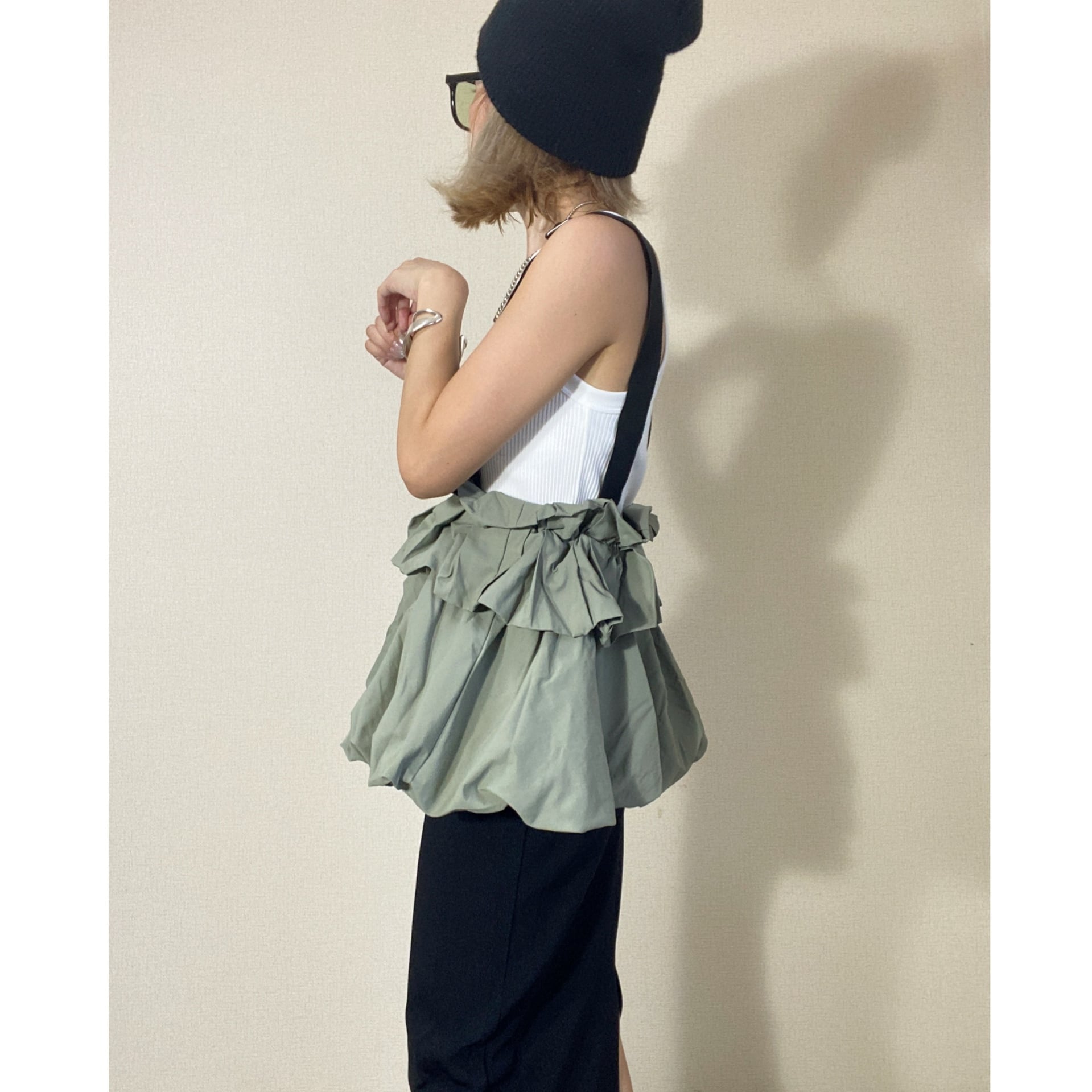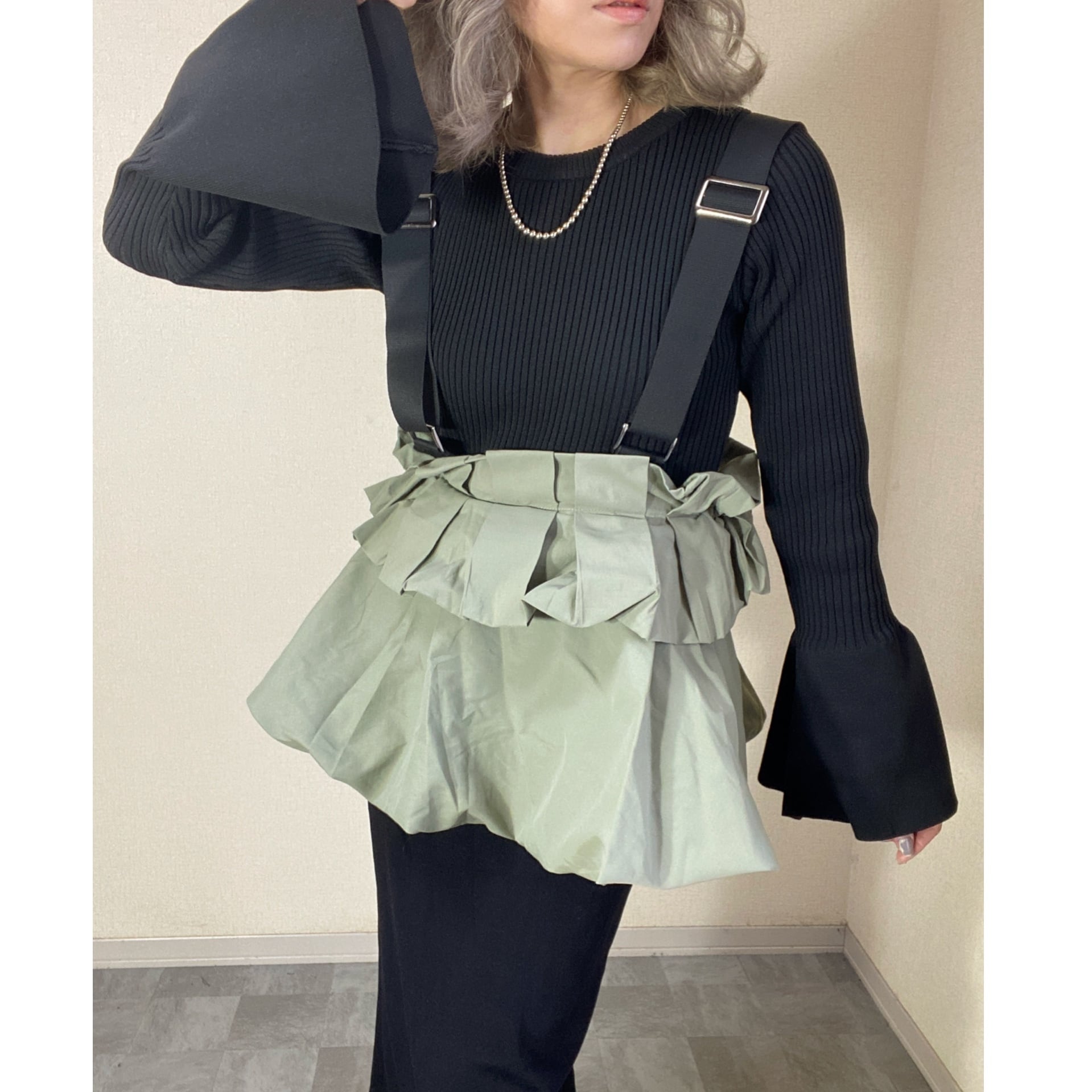 ウエスト部分がぺプラムデザインに見えるような着用方法や、