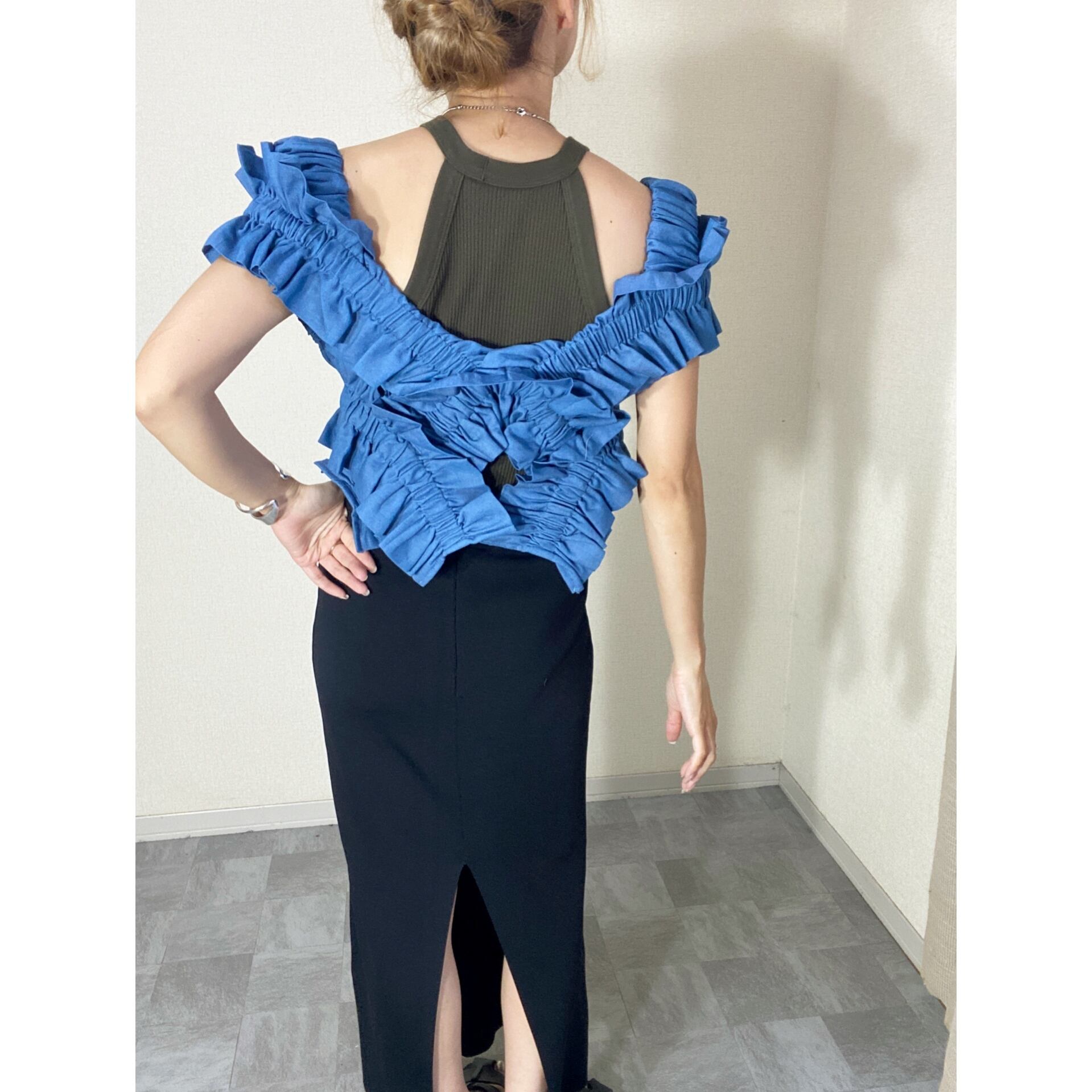 デニムとフリルを掛け合わせたデザインビスチェは